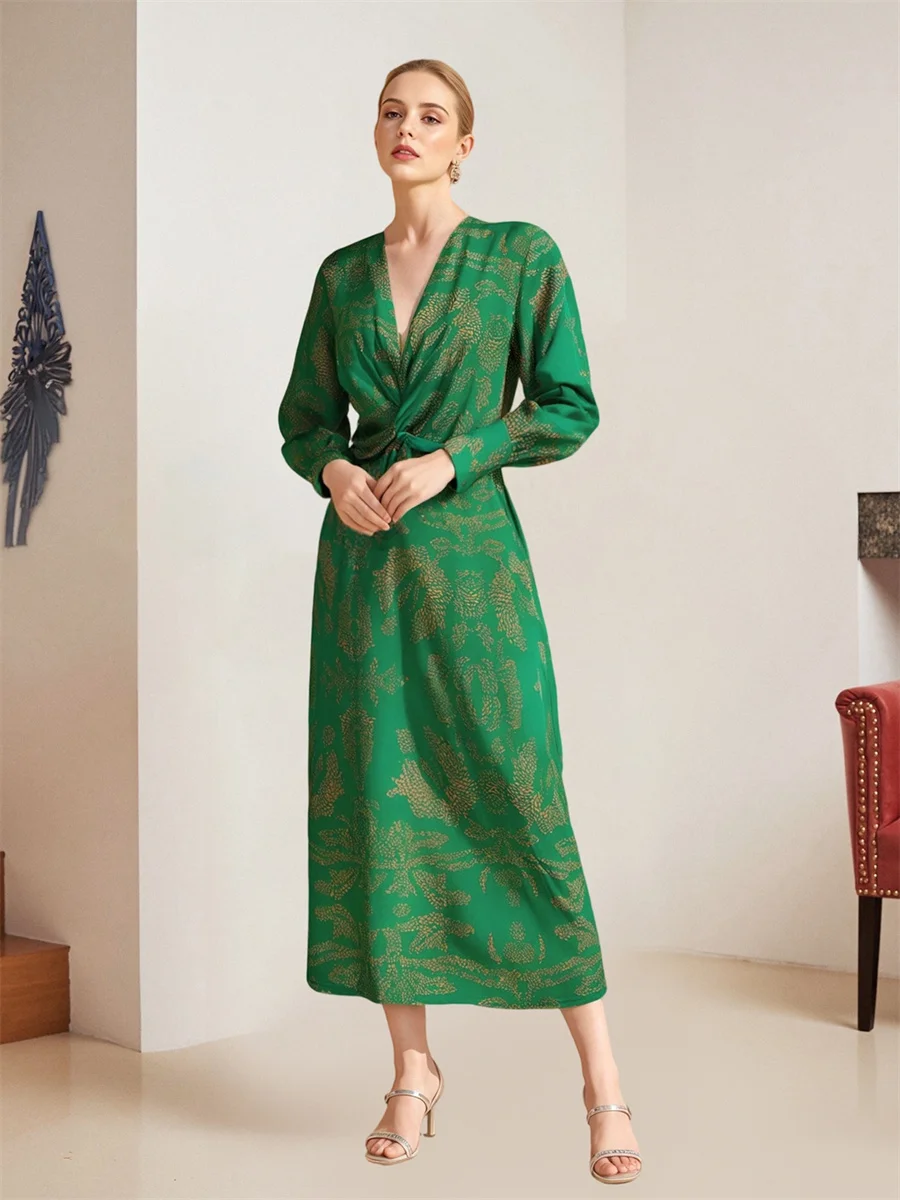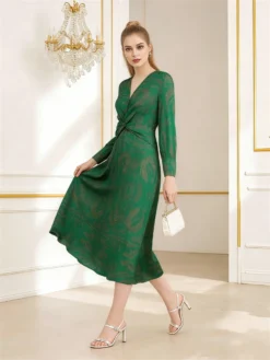 Flower Long Dress for Women Fall Fashionable Deep V Neck Long Sleeve Cinched Waist Dress