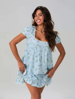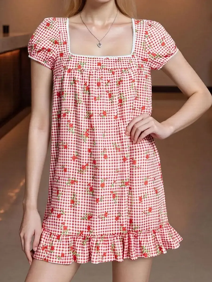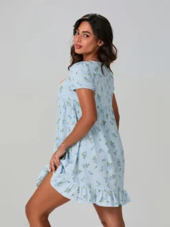 Women's Floral Print Mini Dress Short Sleeve Square Neck Ruffle Hem Babydoll Dress Casual Dress