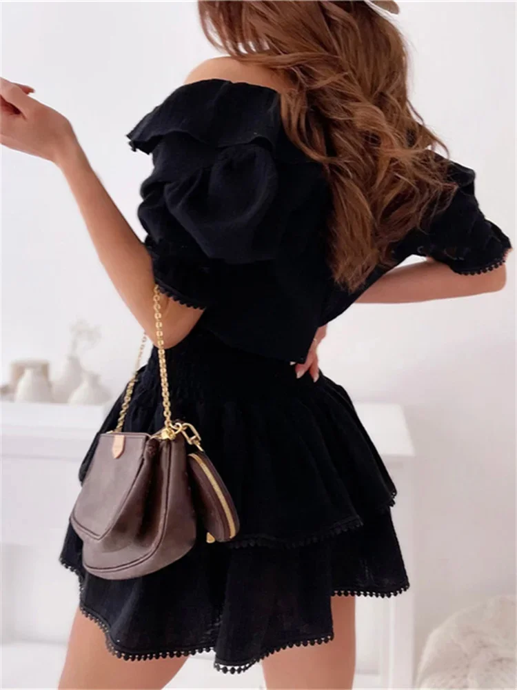 Women’s Warp V Neck Dress, Short Puff Sleeve Solid Color Shirred High Waist Ruffle Mini Dress