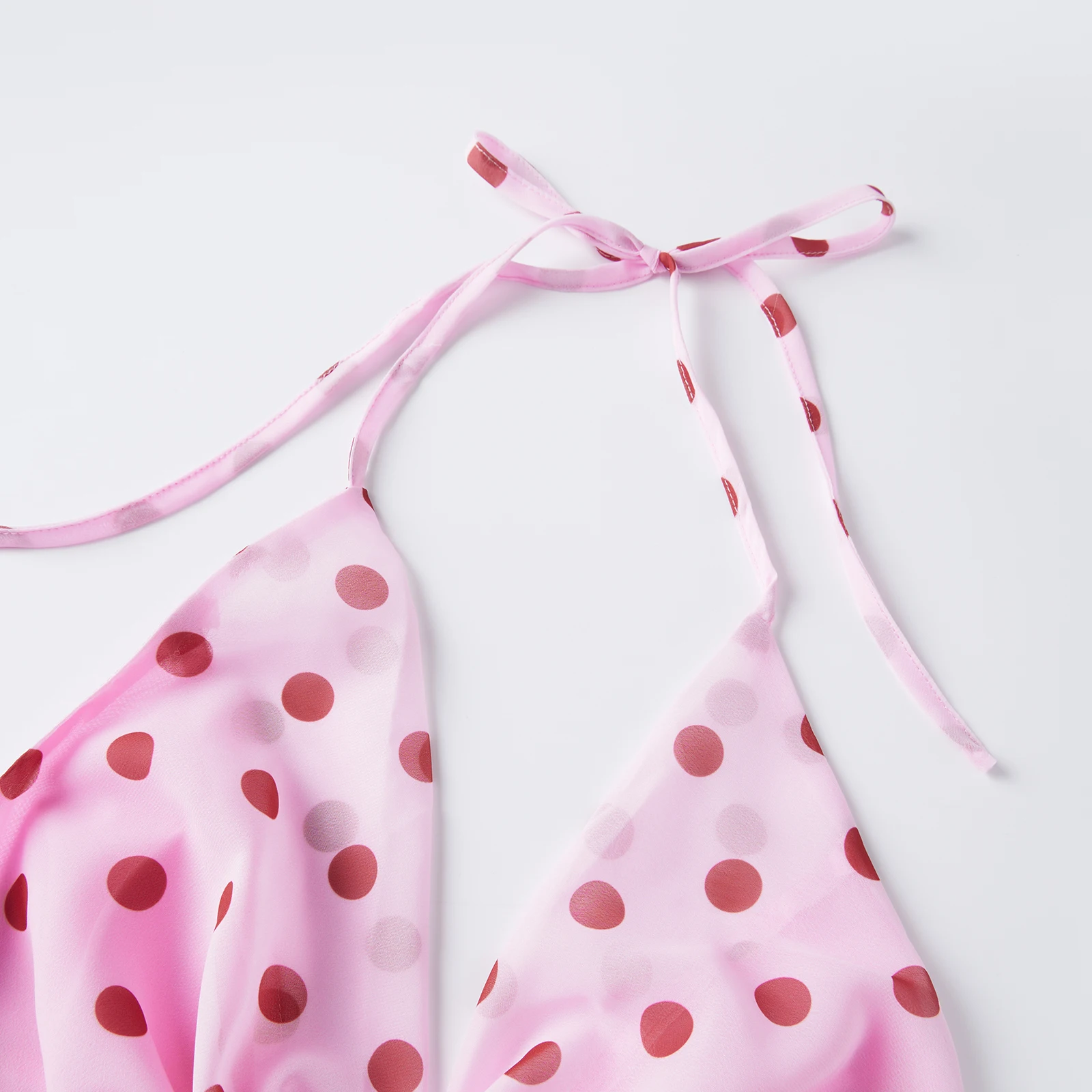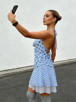 Women’s Dot Halter Mini Dress Summer Fashionable Cowl Neck Sleeveless Backless Ruffle Hem Dress